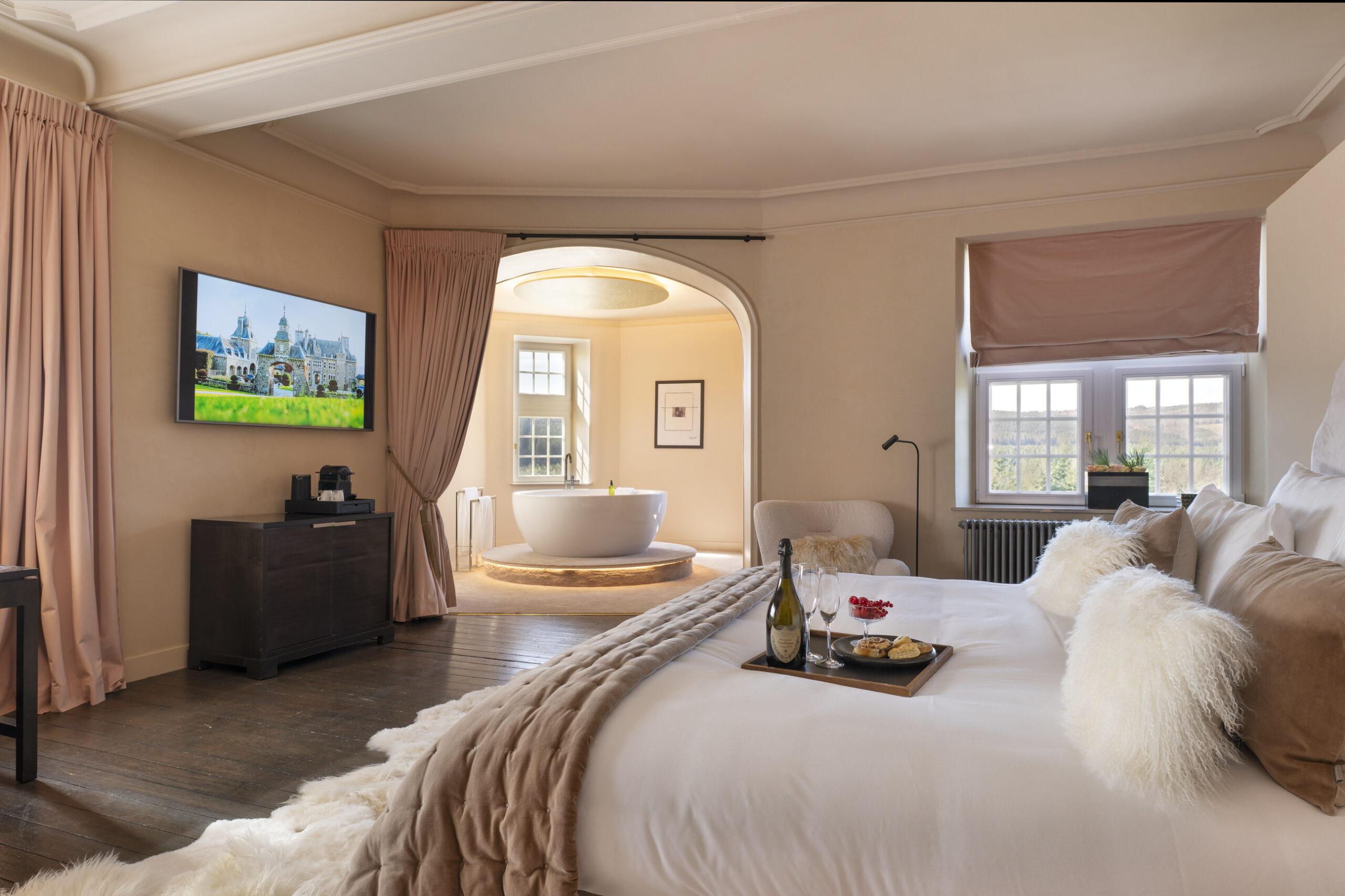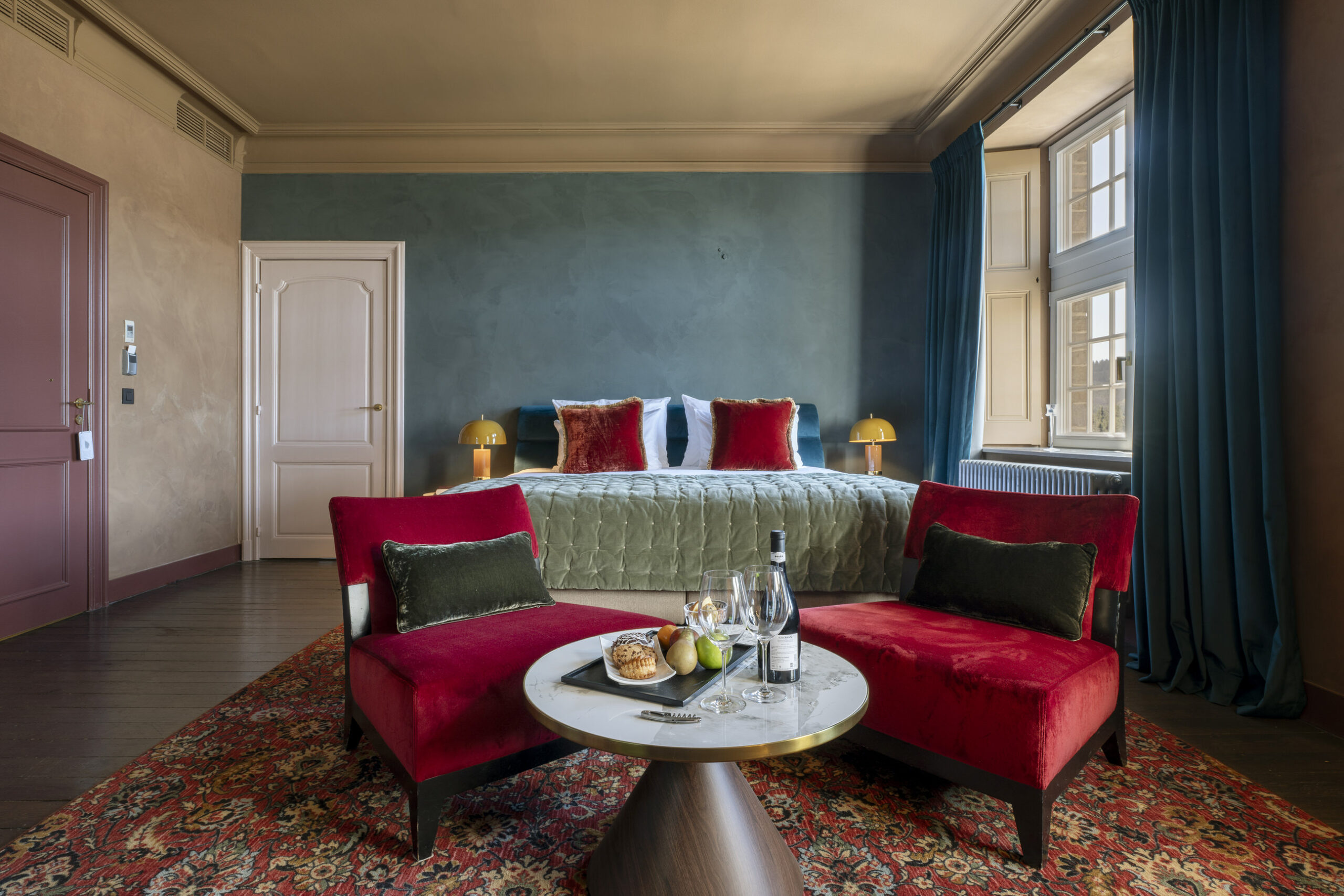 Suites uniques avec vue sur les Ardennes ou sur la cour historique du château. Elles sont situées à la fois dans le bâtiment principal et dans les annexes. Leur superficie varie entre 30 et 60 m².